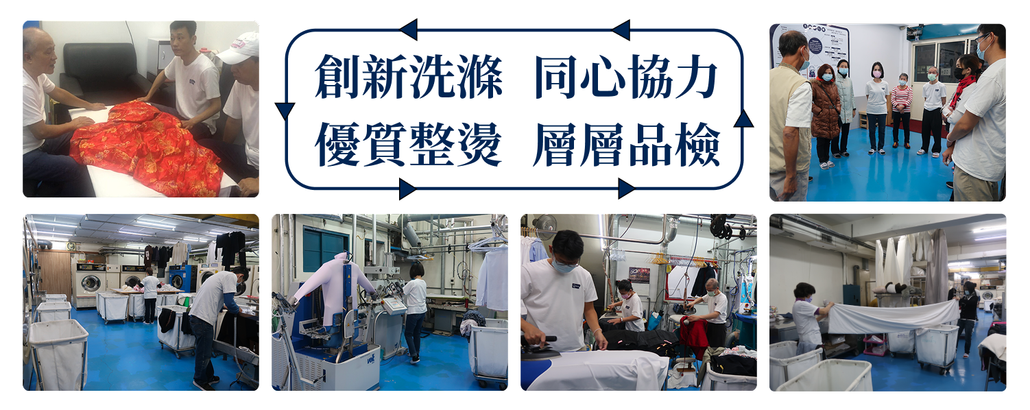 核心洗衣與整燙師傅及整衣人員均具十年以上豐富經驗,全員建立了合和互協的團隊默契與充分授權的自主管理,更確保了作業效率與品質、客户服務滿意。