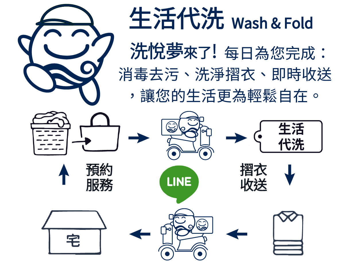 洗悅 自設中央洗衣工廠、複合式洗衣店,並結合洗鞋包店、修改裁縫師,採線上購物車下單付費、到府收送、超商店到店及智取櫃送取,提供高品質一條龍、Line即時回應服務。
