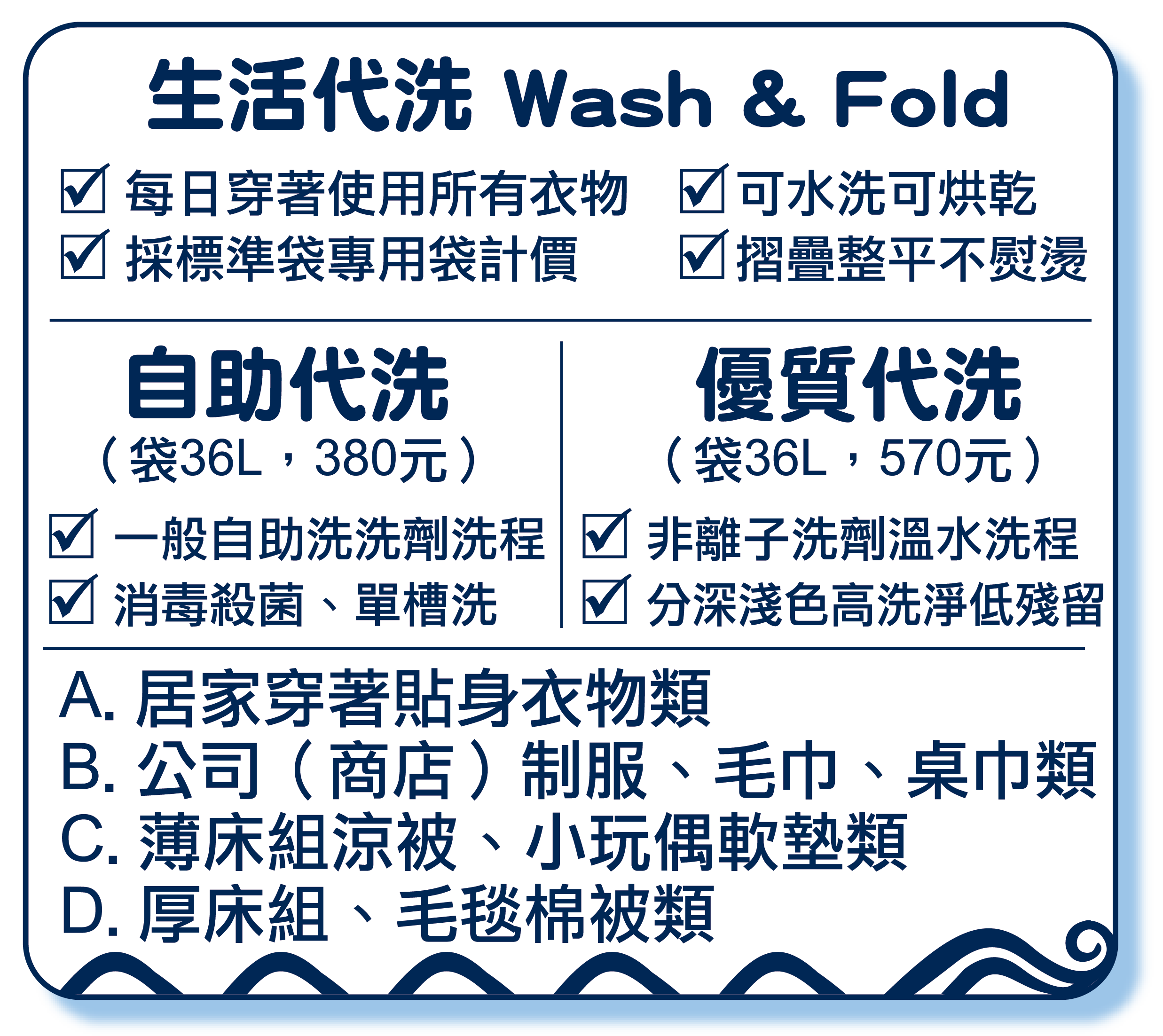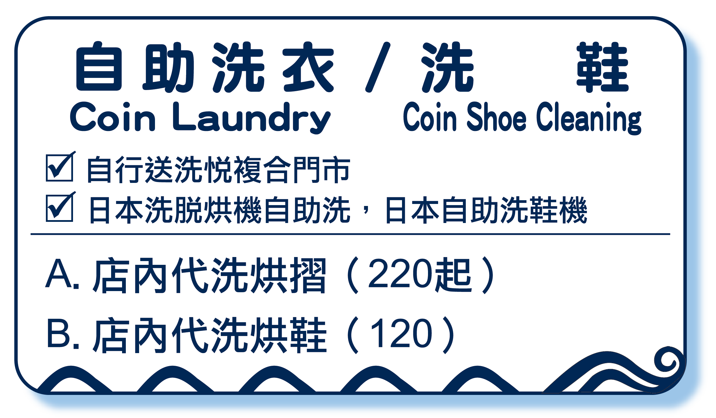 洗悅 自設中央洗衣工廠、複合式洗衣店,並結合洗鞋包店、修改裁縫師,採線上購物車下單付費、到府收送、超商店到店及智取櫃送取,提供高品質一條龍、Line即時回應服務。
