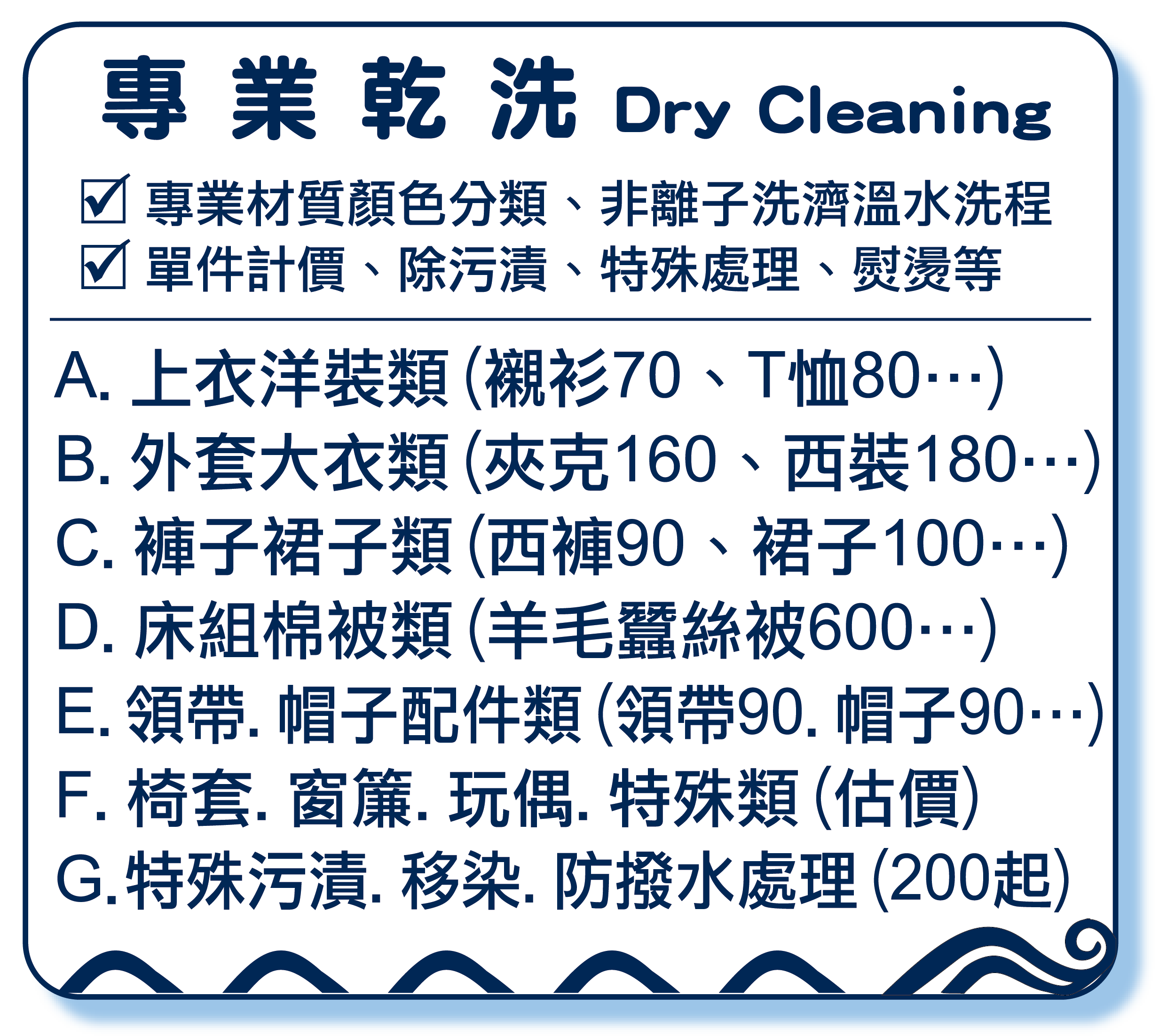 創立於2012位於台北士林(共120餘坪),具備完整的洗濯設備與半自動化整燙作業,達到了標準與效率化的作業流程,創新洗劑與洗程確保洗淨洗白的品質。