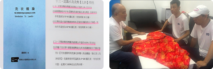 創始人劉先生(具30餘年洗滌專業經驗)因不斷追求專業本質,探求衣料、染整製程源頭,整合實務經驗與理論知識,從衣料、洗劑、洗程不斷試誤中,進而創新洗滌工法,並持續傳承教導技術者,已大幅提升工廠洗淨效果與標準化作業效率。