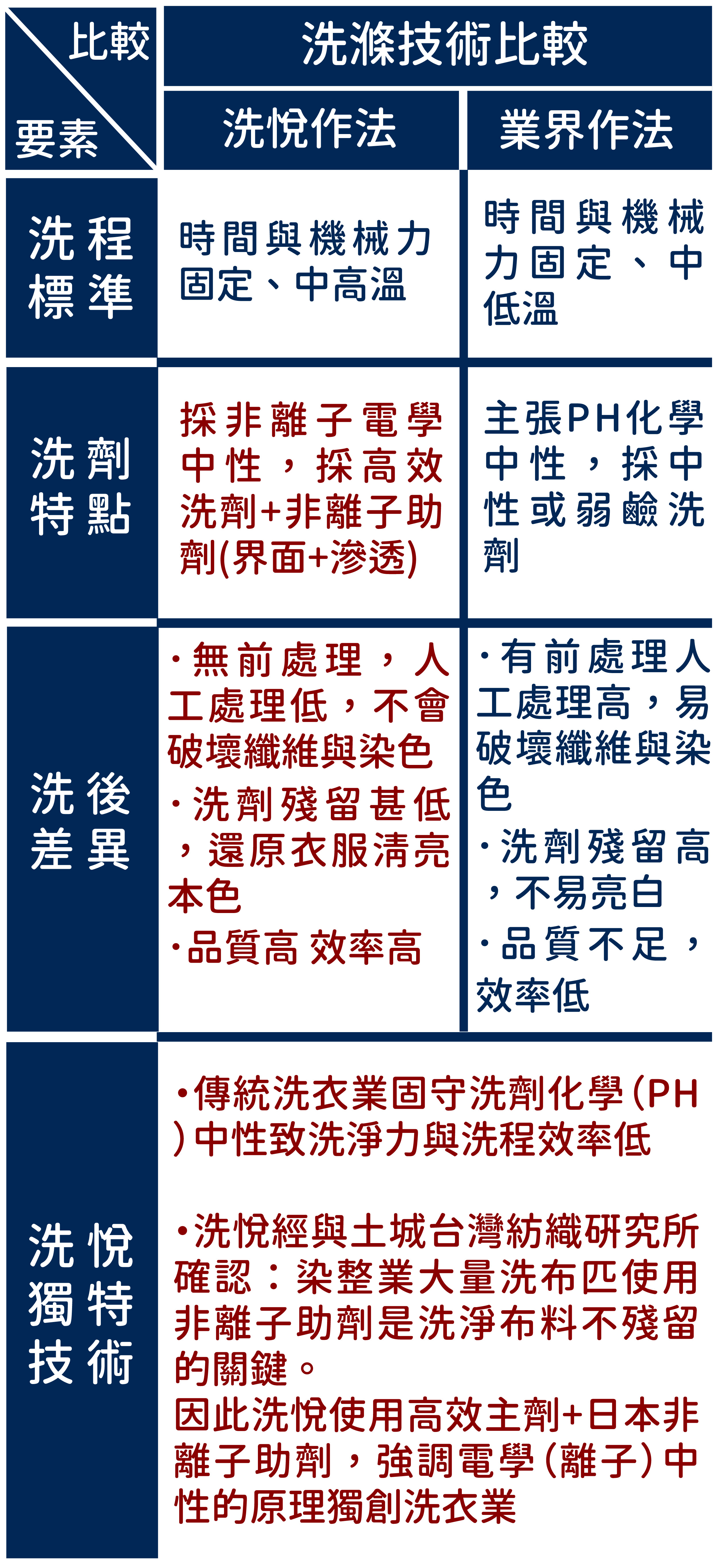 突破洗衣業長期來難以克服的洗淨力與洗程效率盲點;亦即以洗劑的非離子(電學)中性觀點取代傳統以來的PH值(化學)中性的觀念,獨創非離子洗劑與洗程之最佳洗淨力方案=高效主劑+非離子助劑+溫水洗程。